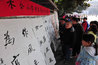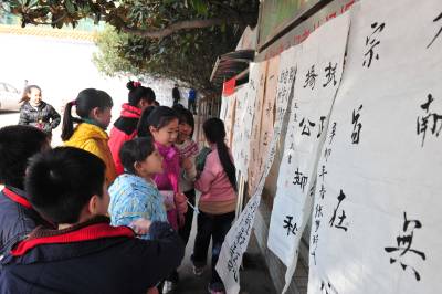 3月7日,在市米公小学,学生们在观看学校展出的学生作品。为从小教育孩子们的廉洁自律习惯,树立廉洁意识,全国书法名校的米公小学在各个班级开展了征集廉洁文化书法作品活动,共征集到书法作品250多幅,学校从中挑选出了145幅作品在校园内展出,既激励学生,也培养她们的廉洁文化意识。