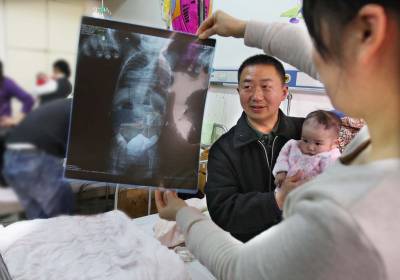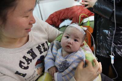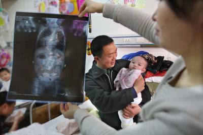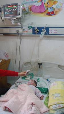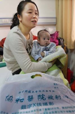 可怜弃婴”父母”心本报视界网杨文明摄影报道”世上只有妈妈好,没妈的孩子像根草......”然而,曾都区第一社会福利院收养的因身患疾症遭遗弃的女婴曾小果,却成了该院10多名”父母”的心肝宝贝。今春,曾小果重病突发,可让院里的”父母”们操碎了心。”父母”们四处求医与生命赛跑,谱写了一曲大爱之歌。2010年8月10日,我市城区一桥头发现一弃婴,被公安110送到曾都区第一社会福利院,经多部门的爱心接力,弃婴总算安了一个”家”。区福利院的工作人员把弃婴取名叫曾小果。据护理人员介绍,曾小果收养不久,体检发现她患有先天性心脏病。今年2月中旬,曾小果突然出现了腹泻和便血等症状,到医院检查后得知,曾小果患有肠套叠,再加上她原本患有先天性心脏病,病情十分危及。2月21日,区福利院决定,将曾小果转往武汉儿童医院治疗。然而,由于手术的风险太大,武汉儿童医院拒绝对其进行手术。不得已,福利院只得将其转往武汉协和医院。经过层层周折,协和医院终于答应对其肠套叠进行手术。记者日前在武汉协和医院儿科住院部看到,刚做完肠套叠手术的曾小果正安安静静地躺在床上,除了床前的体征仪显示她的心率异于常人外,其他一切看上去都和一般的婴儿相同(如图一)。福利院专门派去了多名护理人员轮流照顾她。看得出,曾小果和福利院的护理人员感情很好,她很喜欢护理人员抚摸她、逗她,曾小果的护理人员也把她当成自己的孩子一样对待(如图二)。就连同病房患者的家属都感叹,这些护理人员简直就像曾小果的亲生父母一样。在各方的努力下,曾小果总算是躲过了一劫。但对她而言,真正的考验还未开始。区福利院护理人员张爱华指着拍摄的X光片对记者说:”能否像正常孩子一样健健康康地活下去,还取决于下一步的二次心脏手术(如图三)。”据介绍,仅仅是这次手术就已用去近4万余元,将来的心脏手术还需要大量的资金,光靠福利院的力量是远远不够的,希望社会各界人士都能伸出援助之手,救救这个可爱而又可怜的孩子。2月22日,曾小果在武汉协和医院儿科住院部医治(如图四)。治疗期间,医院的护士们对可爱的曾小果疼爱有加(如图五)。面对多次转送医院诊断书,区福利院的”父母”们对曾小果不遗不弃(如图六)。曾小果的伤痛哭泣,无不刺痛护理”妈妈”们的心(如图七)。3月7日,曾小果第一次手术完成从武汉协和医院康复回”家”了,区福利院的”妈妈”们高兴地抱着这个坚强小宝贝(如图八)。