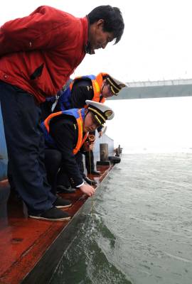 10日,海事官员正在测量船舶吃水深度,对超载航行的船舶实施检查。荆州海事局严厉打击水上超载运输违法行为,他们派出人员和监督艇对超载船进行强行减载,确保水上交通安全。图1:”鄂州航66”船严重超载,海事官员上船检查。图2:海事官员上船实地测量船体吃水深度。(记者杨平摄)