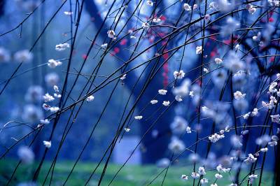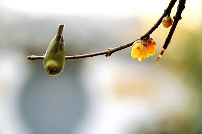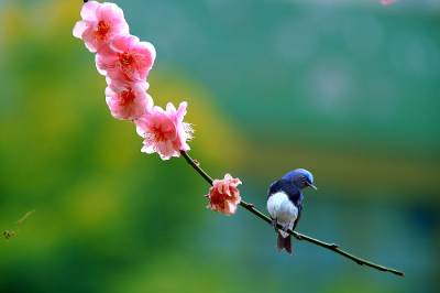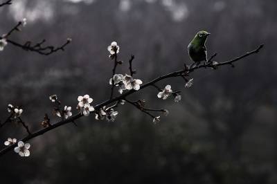 翠鸟啁啾,春梅探幽,好一幅迷人春光图。