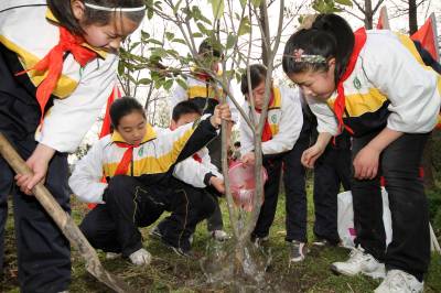 2011年3月10日,小学生在四美塘公园植树。当天,在温暖的春风里,武汉市武昌三角路小学110名六年级学生走进绿意盎然的四美塘公园,栽下绿色,挂上写有希望与祝愿的卡片。