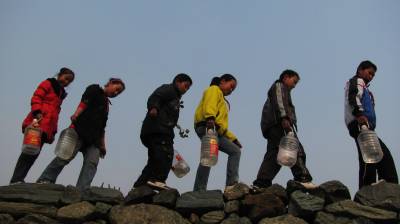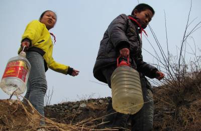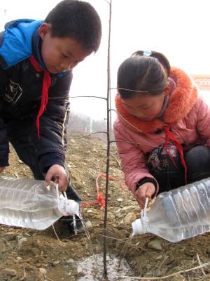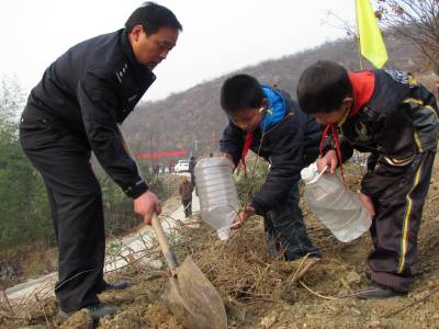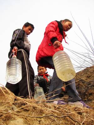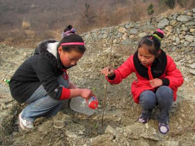 3月11日,湖北郧县谭家湾小学学生正提着水登上该镇陈家崖山头植树。当天谭家湾镇组织当地干群及小学生到陈家崖山头参加义务植树活动,共在山头栽下万株木瓜树苗。