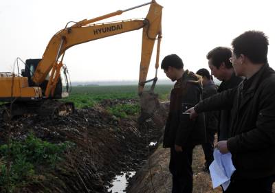 11日,施工人员正在疏通田间的排水沟。荆州市荆州区太湖港管理区正组织挖掘机对田间的沟渠进行疏挖。随着春耕在即,荆州区扎实开展农田水利基本建设,重点改造维修泵站,疏挖灌排渠道,对中小河流进行治理,汛前完成全部主体工程建设,今年力争全面完成农田水利建设土方260万方,标工100万个的建设任务。(记者杨平摄)