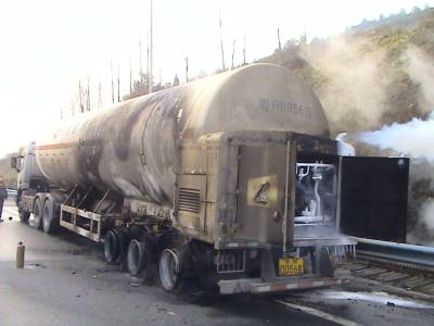 11日凌晨4时许,一辆装载20吨天然气的危化品专用罐式运输车,在行驶至福银高速十堰段1362KM处时,后轮胎突然发生火灾,罐体受到严重的熏烤,随时都有发生爆炸的危险。事发后,高速巡警立即协同十堰市消防、安监等部门人员迅速赶到事发现场将火扑灭。至当日下午13时30分,封闭近9个小时的汉十高速六里坪路段恢复畅通,近百车辆在高管民警的指挥下有序离开该路段。目前,该起事故原因有关部门正在进一步调查之中。(本报视界网徐雁初、范时瑞摄)
