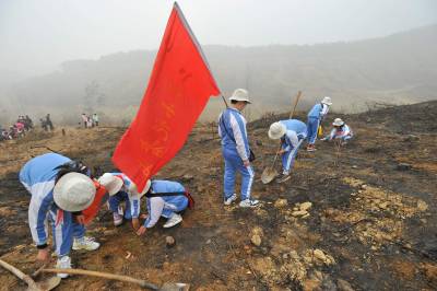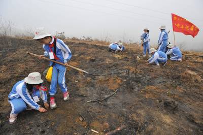 3月12日,湖北省襄阳市第二实验小学的小记者在尹集乡种植树苗。当日上午,襄阳市150名小记者来到襄城尹集乡,在山地种植杉树苗。连日来,襄阳市3500名小记者分期分批在种植树木,营造”小记者林”。
