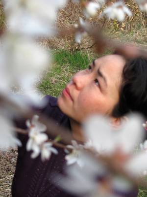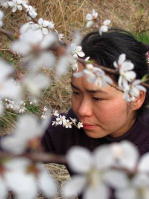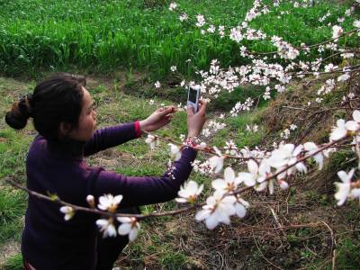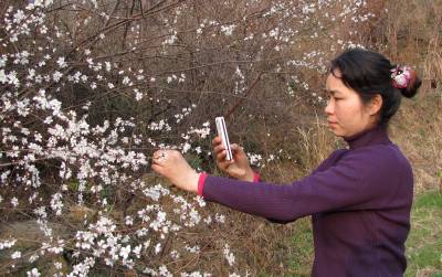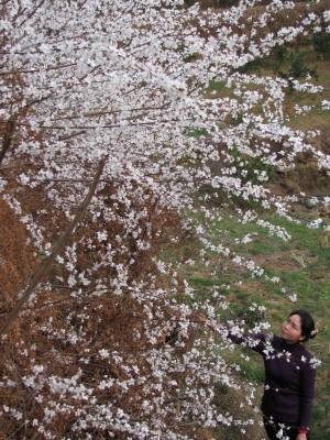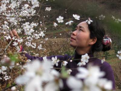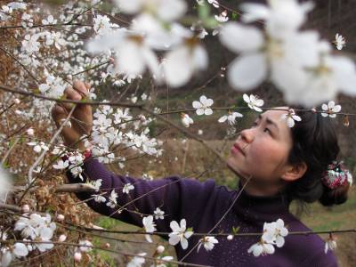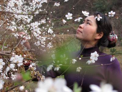 2011年3月12日,一名女青年在湖北省十堰市郧县谭家湾镇云彩山的野桃林里赏花。眼下正是野桃开花的时节,远看野桃林花开白如雪。