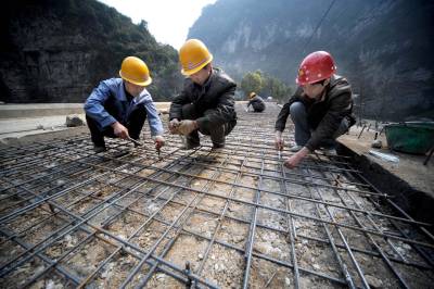 14日上午,道路维修工人在宜昌市三峡西陵峡风景区下牢溪公路桥上捆扎加固的钢筋。总投资5898万元的下牢溪景观带旅游道路综合改造工程目前进展顺利,下牢溪旅游道路综合改造工程一期工程全长8035米,路基宽7米,路面宽6米,为沥青砼路面,到今年9月将全部竣工。记者刘曙松摄宜昌市三峡西陵峡风景