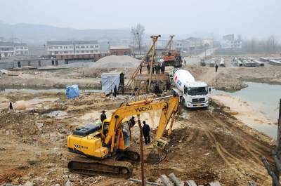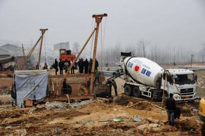 3月14日,湖北省郧县公路局的建桥职工正在施工南化塘镇水毁的滔河大桥,该桥长140米,宽8.5米,投资170万元,8月底竣工通车。2010年夏季郧县遭受持续的暴雨袭击,许多公路及桥梁被洪水冲毁,在修复所有水毁公路后集中力量复建水毁桥梁,预计今年10月底全面修复境内水毁桥梁。图为水泥车正在向桥桩桩基内浇筑混凝土时的情景。周家山卜昌明摄湖北省郧县城管大队电话13872840078邮编442500
