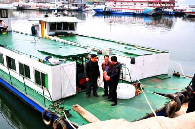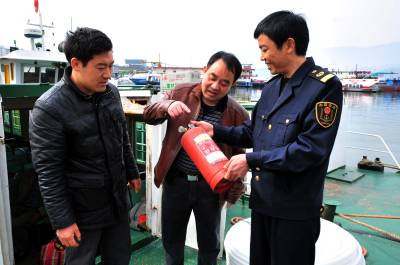 2011年3月16日,湖北省宜昌市夷陵区港航海事处执法人员在三峡坝区太平溪港口对客渡船的消防设施进行检查。当日,三峡海事局发布消息,辖区2010年安全渡运旅客80余万人,三峡河段客渡船已连续十三年”零事故”、”零死亡”。多年以来,三峡地区海事部门与沿江乡镇政府、渡船船民、渡运旅客携手共建”峡江和谐渡”,连续十三年实现客渡船安全无事故。本报视界网张国荣摄