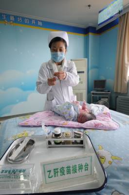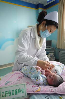 2011年3月18日是第11个全国爱肝日,主题为”爱肝你我同行,构筑健康长城”。据资料统计,我国有七亿人感染过乙肝病毒,1.2亿是乙肝表面抗原阳性,1千多万人是现状型慢性乙肝,并且约有10%的有转化为肝硬化或者肝癌的危险。专家介绍,控制乙肝流行的措施还是靠预防,而预防的最好方法就是给每个新生儿注射乙肝疫苗。图为宜昌市中心人民医院产科护士正在给新生宝宝注射乙肝疫苗。
