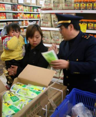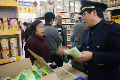 3月16日14时至3月17日14时,孝感市工商局12315消费者申诉举报中心接到电话咨询、投诉24起,称无法买到食盐,或食盐价格猛涨。对此,该局下发紧急通知,要求全市各级工商机关加大市场巡查力度,对制售假冒伪劣食盐、哄抬盐价、囤积居奇等违法行为,坚决依法予以查处。图为执法人员向市民宣传有关食盐法律法规等放心消费知识。