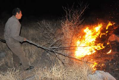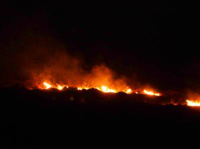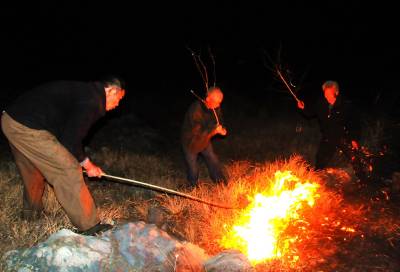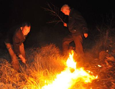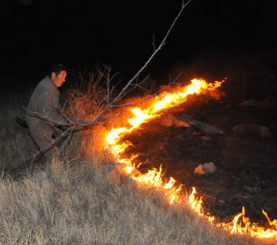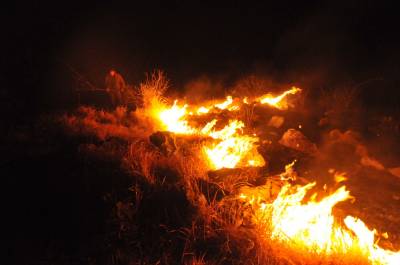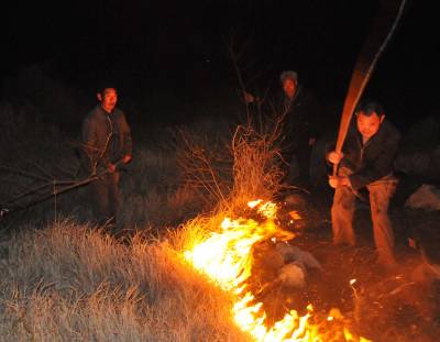 3月18日下午5时,湖北省郧县谭山镇徐家村四组与五组结合部的满子洼山西坡发生山火,山火顺风而动一会向东烧一会向北烧,徐家村32岁的村主任王志红接到报告后迅速组织3人向山火现场赶去,采用树枝扑打山火,并分头截击火头,由于天干气燥山火随风越烧面积越大,四人从下午5:20分开始灭火直干到晚上7:50分经过2小时30分钟才扑灭全部山火。同为64岁的村民陈明珍,王庆德和60岁的王海国已经累的满头大汗湿透了衣服,摸黑下山回家吃晚饭。据徐家村村主任王志红介绍四组与五组结合部的满子洼山并没有农田,山火不知因何而起,过火面积约200多亩,村上将追查此次山火源头,由于村上年轻人都外出打工只有老弱及幼儿和妇女,天黑也只有我们四人就近扑灭这起山火了。图为老汉们正在扑灭山火时的情景。周家山王燕摄湖北省郧县城管大队电话13872840078邮编442500