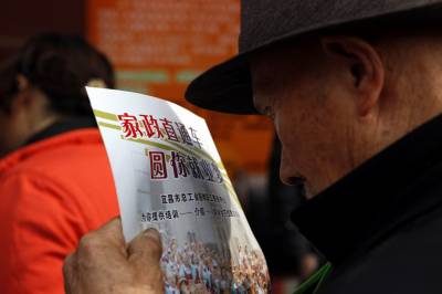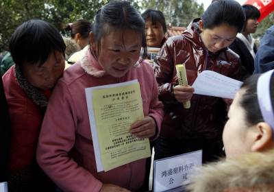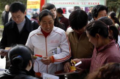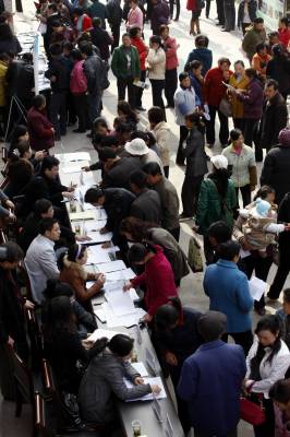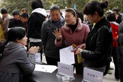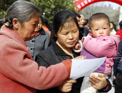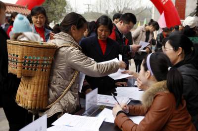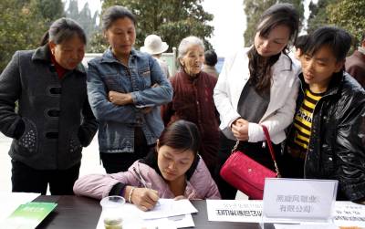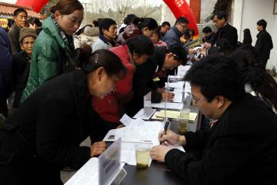 宜昌市劳动部门送就业岗位到农村2011年3月18日,农民在寻找自己合适的就业岗位。当天,湖北省宜昌市劳动部门开展的送就业岗位下乡活动,在点军区联棚乡双溪村进行。针对人多地少的偏僻农村,大量富裕农民没活干的状况,组织宜昌市30多家企业,带着1300多个就业岗位,将招聘现场搬到村庄田头,让山区农民在家门口找到就业岗位。文振效