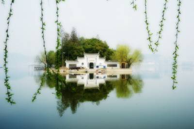 黄石市磁湖的美丽在于雨中,烟雨朦胧中,独具江南风韵。此片多云天拍摄,后期以PS处理成中国水墨画效果。