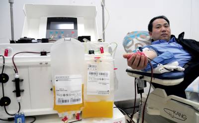 第100次献血22日,黄石市公安局监管支队民警陈辉在市中心血站的血细胞分离机上捐献血小板,这是他累计第100次无偿献血。从1998年开始,陈辉共计献血60800毫升。目前,他已是中心血站的固定捐献者,连续三次获得全国无偿捐血促进奖金奖、黄石市无偿捐血突出贡献奖。黄石市黄石日报摄影部邱孝威摄电话:13807232603邮编:435002