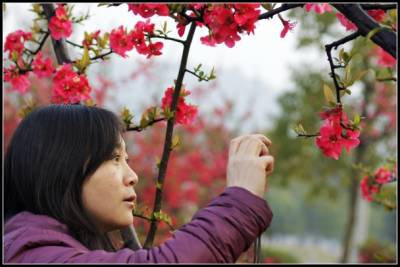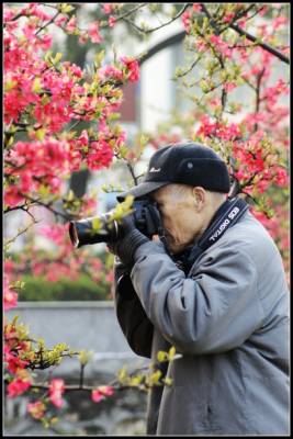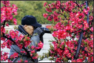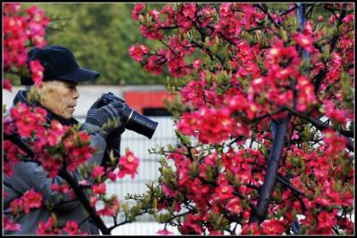 2011年3月23日早晨,一位摄影爱好者在公园里拍摄盛开的海棠花。几天绵绵春雨的滋润,湖北省宜昌市夷陵区滨河公园和河心公园里,各式各样的鲜花竞相绽放,吸引一些摄影爱好者前来拍照,记录春天气息。