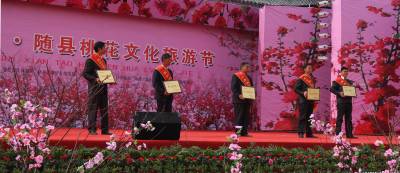 湖北随县2011年桃花文化旅游节开幕3月23日湖北(随州)3月23日,获得优秀称号的油桃种植户在2011年湖北省随州市随县桃花文化旅游节开幕式现场。当日,近2万游客和嘉宾走进桃花园景区。据悉,桃花园景区位于该县尚市镇,油桃种植面积5万亩,通过旅游农业发展有效带动当地农民增收,每年为当地带来直接经济收入近100万元。视界网杨文明摄