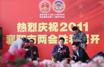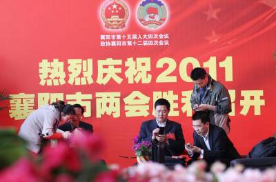 3月27日下午,襄阳市人大十五届四次会议的预备会议刚刚结束,部分人大代表便在襄阳剧院用手机开写”两会微博”。当天,襄阳市第十二届委员会第四次会议正式开幕,襄阳市人大十五届四次会议召开预备会议,截止3月27日16时,已有20多名人大代表和政协委员通过微博晒提案议案,与网友沟通交流。