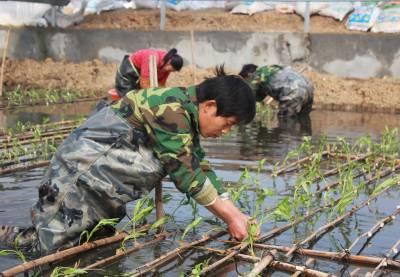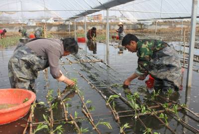 为了搞返季节水面空心菜种植,今年一季度,孝昌大自然农业科技公司又投资150万元,改造了30亩的水塘搭建温棚。目前第一批温棚已经投入了生产。图为3月29日上午,民工们正在往固定在竹排的塑料管中栽空心菜苗。签约摄影师宋俊初摄