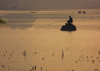 2011年3月16日清晨,金色的霞光洒在武汉月湖湖面,一垂钓者端坐在湖心的礁石上,构成独钓”暖江”宁静的诗情画意景象。