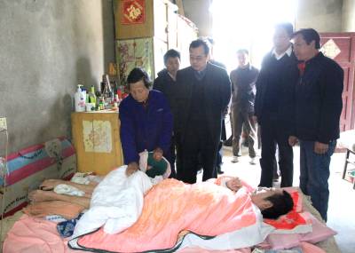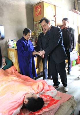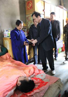 省委老干部局”三万”活动领导小组组长、老干部局主持工作的副局长熊承家同志在仙桃市杨林尾镇段湾村入户访问民情时,得知特困户王金才夫妇因车祸致残,俩人长期瘫患在床,生活不能自理,家庭困难重重。特困户朱德喜因妻子中风两次动大手术,家庭生活非常困难。便立即赶往特困户王金才、朱德喜家中,详细了解病人治疗情况和家人生活情况,并给每户送上1000元慰问金。