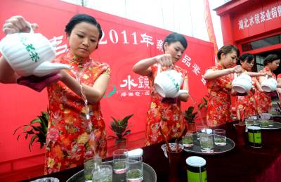 几名茶艺师正在向客人进行茶艺表演。2011年4月6日上午,湖北水镜茶业科技公司在湖北南漳城区举行水镜茗茶2011新茶品鉴活动。来自本地和外地的经销商和市民们品尝了新鲜的高香绿茶。据悉,该公司2010年湖北宜昌邓村落户南漳后,当年产值超过4000万元。