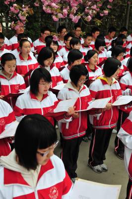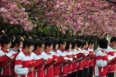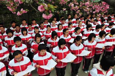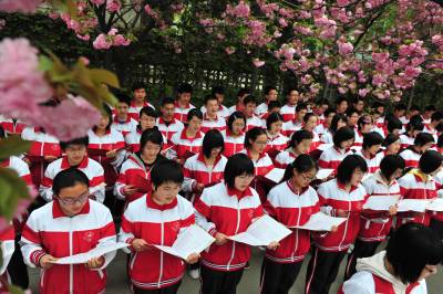 4月11日下午,襄阳四中高一年级1800多名学生在校园内齐颂儒家经典名篇《弟子规》、《劝学》等,对学生进行儒家传统教育。据了解,这是该校对学生进行传统道德教育的一个内容,学校通过开展各种活动,对学生进行道德修养教育。