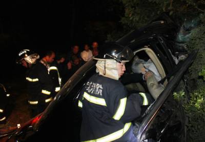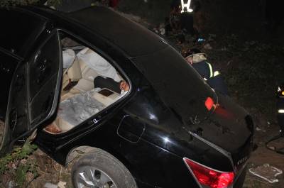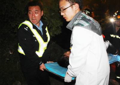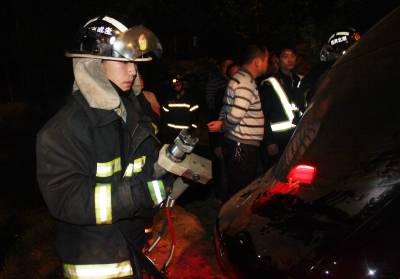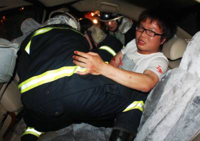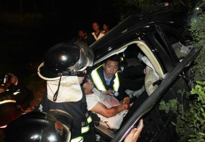 4月14日晚22时10分许,一辆疾驰的黑色广本小车失控冲到107国道1156公里+200米处的路基下,严重变形的车体困住后座上的一男一女。孝昌县陡山乡陆联村7组几名村民,齐心将受伤妇女救出后,该县交警大队民警和赶来的消防战士联手,破拆救出被困男子。签约摄影师宋俊初摄