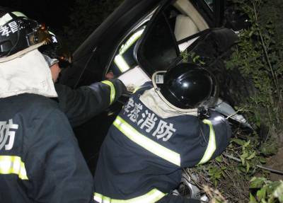 小车冲下路基变形车体困住2人 村民、消防战士和民警接力救出(组图)