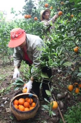 4月17日,柑农颜德敏在橘园采摘晚熟”伦晚”。当天,中国脐橙之乡的湖北省秭归县郭家坝镇邓家坡村晚熟”伦晚”正式开园。据介绍,该村是秭归县产柑大村,是华中农学院晚熟”伦晚”新品种试验基地。近几年来,该村在华中农学院的技术支持下,在该村两个社区率先实施品种改良和推广新品种获得成功,且成效显著。仅全村两个社区种植的晚熟”伦晚”新品种一项就增加纯收入200多万元,是改良前普通脐橙收入的10倍。该村3组柑农颜德敏年收入超过10万元,年收入在10万元以上占到该村的三分之一,成为屈乡大地有名的”富裕村”。(何宝喜摄影报道)