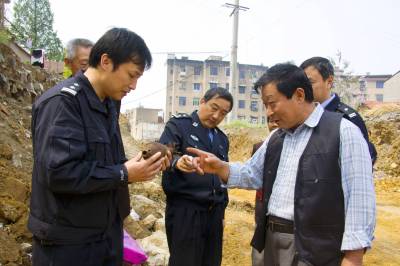 京山县申公路施工现场惊现一炮弹4月21日上午,在京山申公路一施工现场惊现一枚炮弹的消息不胫而走。发现者杨志清用塑料袋提着捡来的炮弹,带领县治安大队人员前往发现地。前两天,退休职工杨志清中午路过申公路施工处时,眼尖的他发现了埋在泥土中的一处铁片,扒出来一看竟是一枚小型的炮弹。他拿回家家中放了二天,还是觉得不放心,在前去公安局报案途中遇到了同事,同事替他立刻打110报了案。治安大队队长范兆云查看炮弹后签定这是一枚迫击炮弹,只有在强烈炸药的作用下才会引爆,让大家不要恐慌。目前这枚迫击炮弹已由警方带回,将进行集中销毁。(张文胜摄)