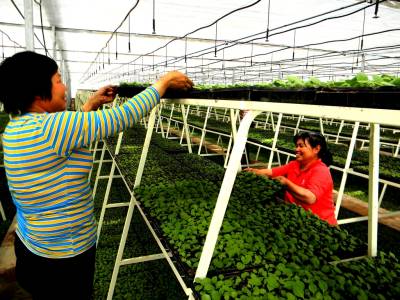 29日,在房县土城镇土城村的烟叶育苗大棚内,几位村民们正将上下三层的烟苗互调位置,以调节生长。今年,该育苗基地开始推行三层悬式立体育苗模式,有效提高了大棚空间利用率,从而提高了育苗经济效益。陈竹任学鑫摄