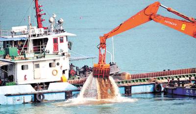 8日,船舶承载着大型挖掘机在长江三峡大坝—葛洲坝“两坝”间的宜昌市夷陵区乐天溪河段清除航道碍礁石。“两坝”间乐天溪河段航道整治工程投资1.57亿元,是“两坝”间急流险滩航道整治的首期工程,主要炸除船舶航行水域的14处碍礁石,炸礁总量27.7万立方米。该工程去年12月底开工,计划于明年7月完工。竣工后,乐天溪河段通航及待泊环境将得到较大改善,船舶经过三峡船闸将更加顺畅安全。 (本报视界网 张国荣 摄)