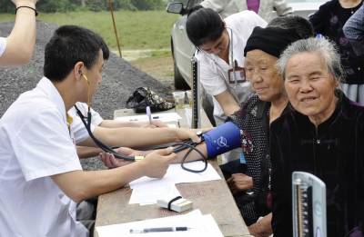 5月10日,宣恩县沙道沟镇补溪村村民正在村门口接受健康检查。当天,宣恩县“三万”活动领导小组带领县民族医院在该村开展以“送医送药送健康”为主题的“送温暖、办实事”活动,共为128位村民进行义诊,免费发放价值1000余元的药品。 本报视界网 李以国 田代超 摄