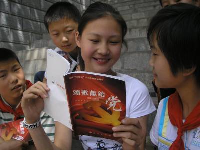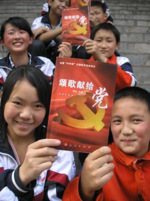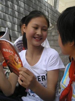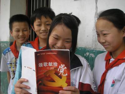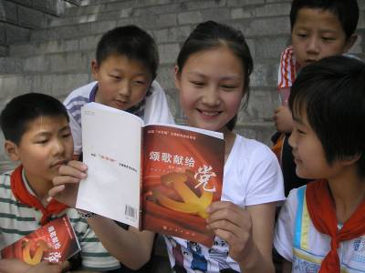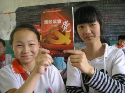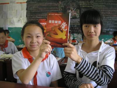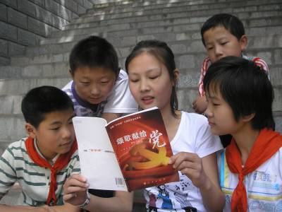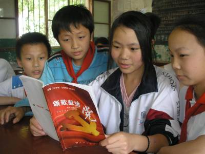 5月12日,郧县茶店中学学生和茶店小学学生在一起读《颂歌献给党》书籍。为纪念中国共产党成立90周年,该县中小学校全面开展 “中华魂”( 颂歌献给党)主题教育活动。茶店中学学生向茶店小学学生开展赠书,并结对子,交流学习心得,共同促进学生们爱读书、想读书的习惯。本报视界网:曹相聪 摄