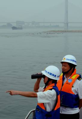 12日,海事官员正在护送大型船舶通过太平口浅水航道。日前,长江枯水,4月29日,荆州段航道水位降至负0.1米,荆州海事局派出工作人员加强现场管理,科学指挥船舶有序通行,对大型和重点船舶全程护送通过浅水航道,确保长江荆州段航道畅通。 (记者 杨平 摄)