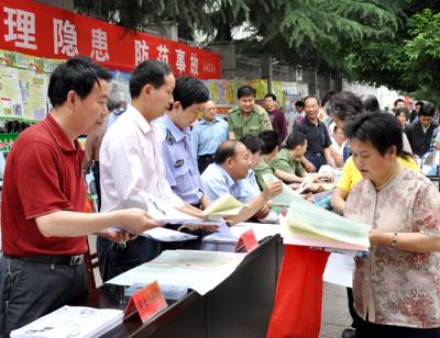 竹山县是全省唯一的地震烈度7度设防区,地质灾害频发,每年组织多种形式的灾防知识普及,消减自然灾害对群众生命财产安全带来的损失。5月12日, 该县组织国土、地震、民政、消防、林业、农业、水务等20多个单位上街开展灾防知识宣传,通过发放传单、问题咨询、组织消防灭火和逃生演练等形式,宣传各种灾防知识,使公众应对突发灾害的能力得以提高。图为宣传工作人员在为行人讲解地质灾害防治知识.(石濡华 陈昌荣 摄)