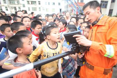 5月9日,荆门市消防支队东宝中队官兵深入浏河小学开展师生应急避险演练和防灾减灾宣传活动,向学生讲解疏散演习避险逃生的基本知识和技能,并进行了火灾逃生演习,切实提高广大师生防范自然灾害的意识和能力。图为学生们在了解蛇眼生命探测仪器的使用方法。( 本报视界网 宁新生 摄 )