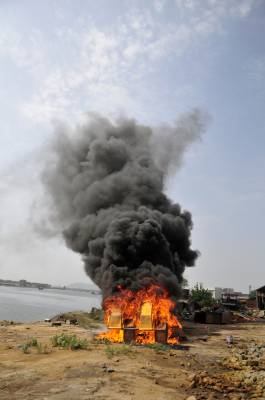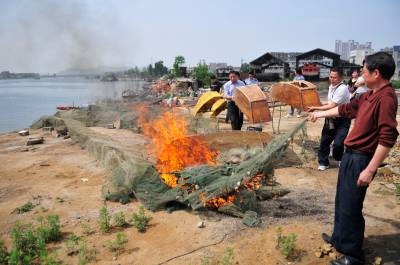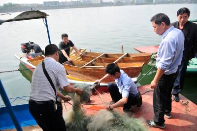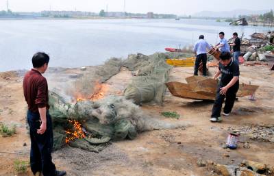 自5月11日夜间起,襄阳市水产局执法人员乘船在汉江城区段进行搜索,直至5月12日上午共收缴16个“地笼”,5条“粘网”和3条“挑船”,并于10时许在汉江与小清河交汇处附近进行集中销毁。