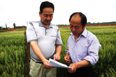 日前,湖北省襄阳市大力实施人工增雨作业,鄂西北大地普降大到暴雨,使全市麦田旱情得到有效缓解。暴雨过后,襄阳市气象局农业气象人员深入襄州区、南漳县丘陵山区、枣阳市低丘岗地对设施农业及干旱小麦墒情进行实地监测普查,将“量身定制”的夏收夏种天气预报、育秧技术指南、农事建议等气象信息送到当地农民群众手中,为广大农户提供现场服务指导。图为襄州区农试站站长把抗旱农事建议送到市良种场生产科长阮吉洲手中。