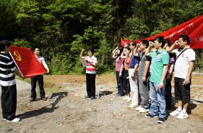 “我志愿加入中国共产党,拥护党的纲领,……为共产主义奋斗终生,随时准备为党和人民牺牲一切,永不叛党。”5月13日,湖北省宜昌市夷陵区物价局党员们庄重地举起右手,精神饱满,气宇轩昂,面对鲜艳的党旗,再次发出铮铮誓言。为纪念建党90周年,夷陵区在机关团体中开展了以“唱红歌”、“在党旗下重温入党誓言”、“我为党旗添光彩”等为主题的党日活动,以表对党、对祖国、对人民的深挚的热爱。本报世界网 周建平 摄