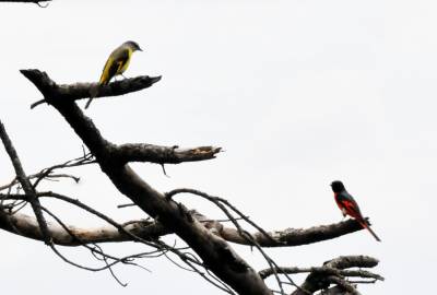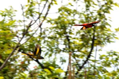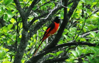 5月14日,郧县摄影家协会会员在沧浪山国家森林公园海拔1826.6米主峰上采风时,惊喜的拍到了一对红色和金黄色小鸟,当地向导称之为吉祥鸟,这对小鸟一直围着我们飞来飞去直到我们离开。 图为笔者拍到的一对红色和金黄色小鸟正在树上时的情景。 周家山 杨泽华摄 郧县城管大队 电话13872840078 邮编442500