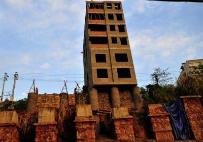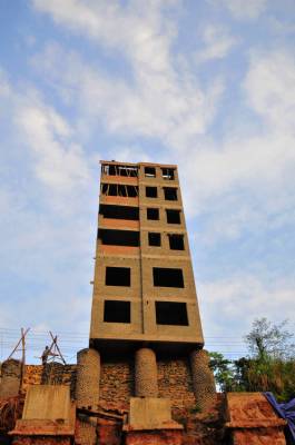 巴东县信陵镇北京大道上在建的一栋民房。远远看去,犹如一座炮楼,脚下的桩基像一颗颗钉子,但给人的感觉又很不稳重。
