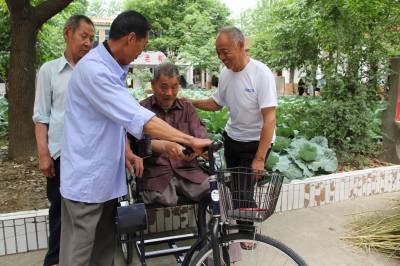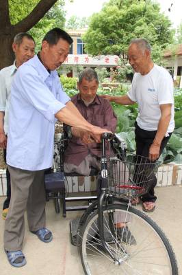院民坐上新轮椅 5月15日,谷城县冷集镇中心福利院院民在“欣赏”陈经会的新轮椅。日前,一位不愿透露姓名的好心人,在走访冷集镇中心福利院院民时发现,入院前因车祸被截去右腿的院民陈经会行动很不方便,更不用说外出“散步”了,。于是,他无偿的为陈经会捐赠了这台新轮椅。坐上新轮椅的陈经会说:“有了它,我的‘行动’真是方便多了。” 本报视界网马明刚摄