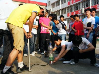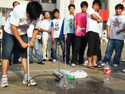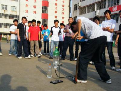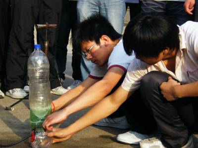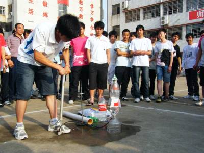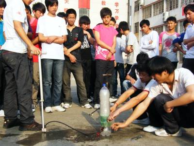 17日,云梦县梦泽高中的学生在参加学校组织的制作“水火箭”比赛。该校成立了多个科技兴趣小组,由专门教师指导,定期开展科技制作比赛活动,展示学生的科技成果。 视界网周晓文摄
