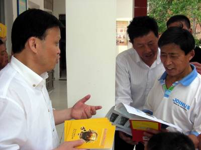 5月16日,黄梅县地震办干部(左)向分路镇新坝村农民讲解防震减灾知识。当天,该县地震办在该村开展“智力帮扶”活动,免费向该村“农家书屋”赠送250本防震减灾科普书籍和18张挂图,并面对面向农民讲解防震减灾知识,提高农民应对地震灾害的能力。(本报视界网吴志雄 摄)