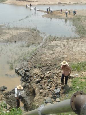 干群齐上阵,抗旱保春播。4月18日,红安县城关镇小丰山村村民在县“三万”工作队和镇村干部的带领下,来到倒水河垒筑河坝蓄高水位,使抽水机顺利抽水上岸(如图)。5月以来,该县组织抗旱机械2500多台(套),投入抗旱资金3300万元,出动送水车30多辆,抗旱面积达25万亩。 张军胜 杨友余 韩果摄影报道 联系电话:13597554196