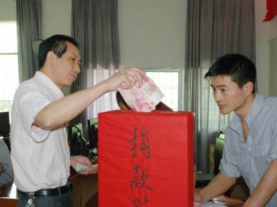 5月19日,宣恩县文体局一职工在该局“三万”活动捐款仪式上捐款。该局在“三万”活动中,积极开展“送政策、送温暖、送科技”活动,先后为联系村进行巡回义演、赠送文体用品、帮助修缮村级办公场所、为群众义务劳动。针对当前农民正值抗旱保春耕春种关键时期,该局启动“三万”活动捐款仪式,组织全局干部职工共捐款12000余元,用于支持群众购买抗旱设备和农资肥料等物。 本报视界网 李以国 旬杰 摄