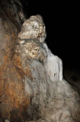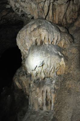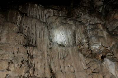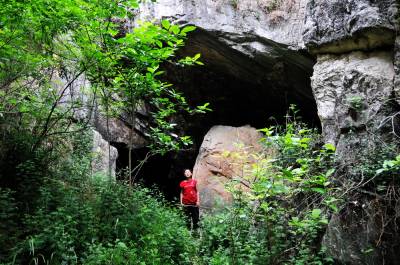 5月19日,笔者慕名来到十堰市郧县谭山镇渔塘河村4组探秘地门洞,上午8时来到渔塘河村4组请了两名当地村民当向导,越过渔塘河向东爬上五条腿山沿小路来到地门洞洞口,洞口高有6米,宽有5米,洞口右侧有一块尖形三角石堵在右侧,在洞口外10米处感觉凉气和凉风袭人,树叶都被凉风吹的直动不停,进了洞口感觉与外边完全是两个世界的温度,温差太大,我开始了2个多小时的探险和拍照.