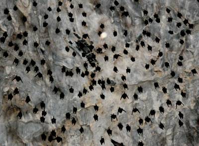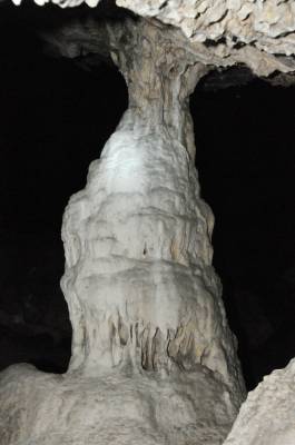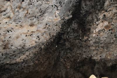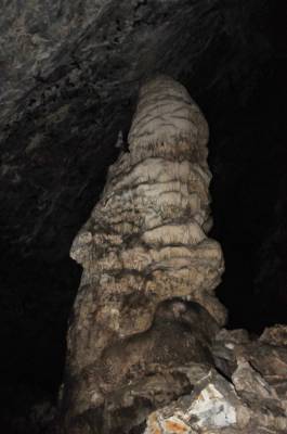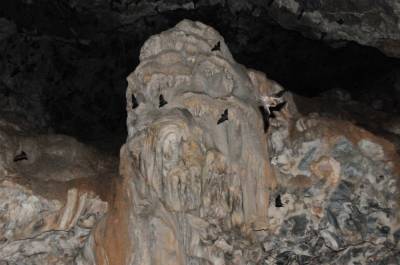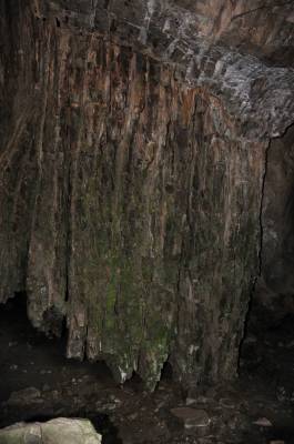 洞内大厅东西宽有50余米,南北长150余米,用矿灯照在洞内,洞内高有30余米,洞内大厅四周有许多小洞,还有许多钟乳石,千姿百态,有的象瀑布,有的象冰川,洞西有一座石塔,高有7米,直径4米,圆形石塔上石冰川朵朵非常好看,让人赞叹大自然的鬼斧神功,实际石塔是洞顶千百万年滴水而下,滴在地上一点一点慢慢锈堆起来的结果,是一尊天然华表的艺术品.洞内大厅的北侧洞顶有一层黑鸦鸦的蝙蝠,人一来到北侧蝙蝠在人周围和头顶飞来飞去,感觉让人喘不过气来,密密码码的很是壮观,估计得有10000只以上,洞下地面是厚厚的蝙蝠屎,踩在上面软软的.在洞口向南穿过长廊来到南面的小洞口,渔塘河就在洞口下方,小洞洞口高4米,宽4米,在向北我经向导指点爬上南面向上通往山顶的天门洞洞口方向爬去,费了半天劲爬到了中腰在垂直石墙面前在也无法向上爬了,只的在中腰小洞内看看,地上有久远的木炭痕迹,有几块碎青砖,又费了半天劲才小心的下到地面.向导介绍说上世纪70年代有两名年青人来此探险,他们是从山顶的天门洞下去的不知怎么搞的,其中一人滚下洞里,从地门洞里摔下来当场摔死,从那以后在无人敢进山顶的天门洞了.上世纪70年代至80年代村上放电影就在地门洞里,全村老少都在洞里看电影.那时村上人乘凉都在洞里.来到洞外仔细观察,进出山洞的路是人工用石头垒起来的,高有6米,宽4到6米不等,只是上面长满了树和灌木林.